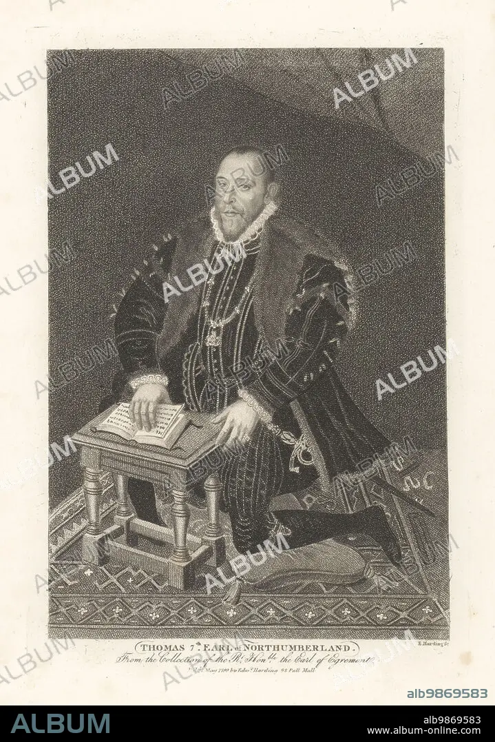 Caption: Thomas Percy, 7th Earl of Northumberland, kneeling on a cushion, wearing a black doublet with a fur trimmed cloak, a white ruff and the Order of the Garter collar and garter, court sword, reading a prayer book. Thomas, 7th Earl of Northumberland, executed for treason, 1528-1572. From a painting by Steven van der Meulen in Earl Egremont's collection at Petworth House, West Sussex. Copperplate engraving by Edward Harding from John Adolphus The British Cabinet, containing Portraits of Illustrious Personages, printed by T. Bensley for E. Harding, 98 Pall Mall, London, 1799.