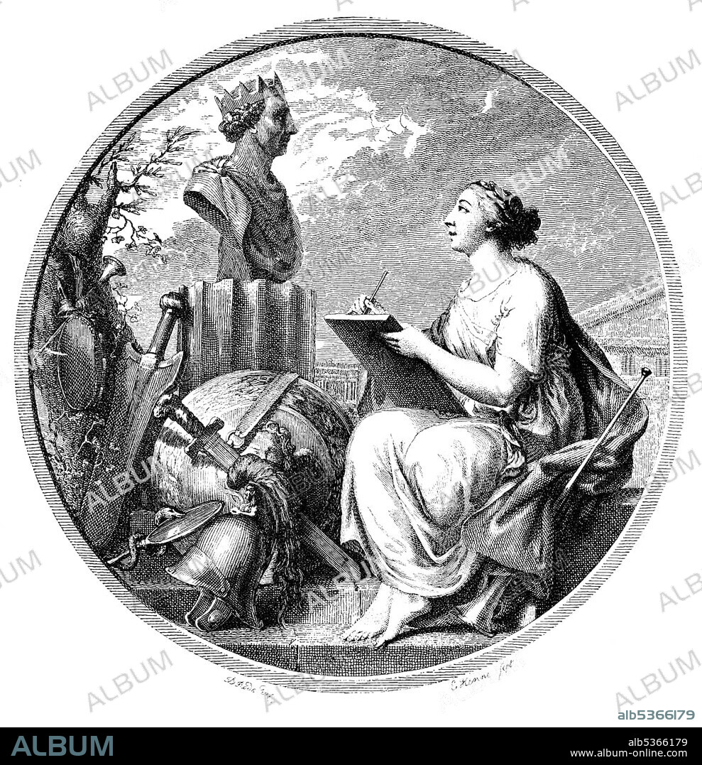Caption: Historic print, copper engraving, 1800, Kalliope with a bust of Frederick II, title page by Karl Wilhelm Ramler, 1725 - 1798, a German poet and philosopher, from Bildatlas zur Geschichte der Deutschen Nationalliteratur, an illustrated atlas by Gustav Koennecke, 1887