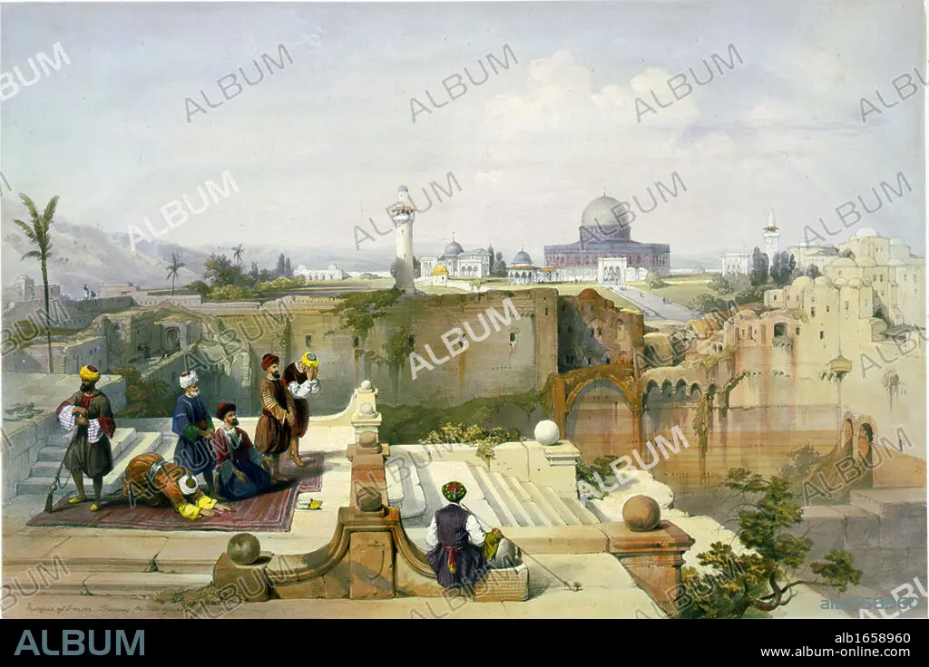 Caption: Mosque of Omar, shewing the site of the Temple' c1840. After David Roberts (1796-1864) Scottish Artist. Muslim men at prayer on prayer rugs, guarded by man with gun. Palestine Jerusalem Ruin Religion Islam