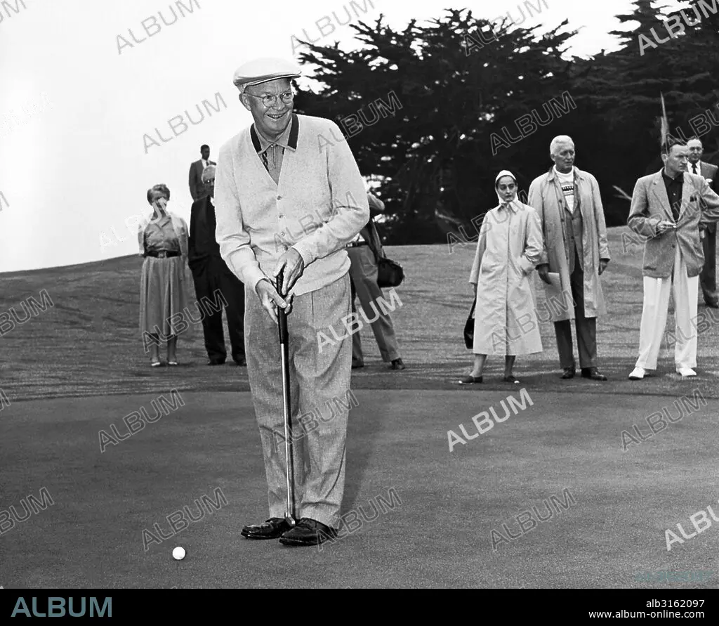 Pebble Beach, California: 1956. President Dwight Eisenhower putting at Pebble Beach, California.