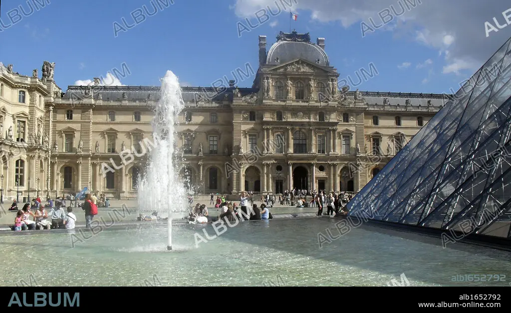 Caption: Louver Museum exterior of with part of the 'Louvre Pyramid' at the Louvre museum, Paris France. Designed by I. M. Pei