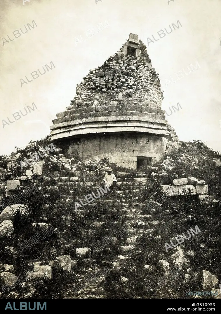 Caption: View of the observatory at at Chichen Itza, known as El Caracol (the snail) for its interior spiral staircase. The structure, with its unusual placement on the platform and its round shape (the others are rectangular, in keeping with Maya practice), is theorized to have been a proto-observatory with doors and windows aligned to astronomical events, specifically around the path of Venus. Chichen Itza was a large pre-Columbian city built by the Maya civilization. The archaeological site is located in the municipality of Tinum, in the Mexican state of Yucatan. The Maya their highest state of development during AD 250 to 900. Photographed by Désiré Charnay (1828-1915) in 1882.