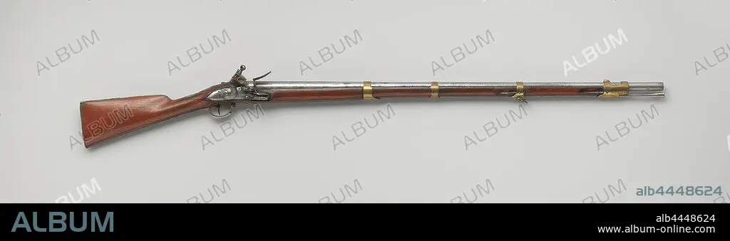 Caption: Military flint gun, The lock plate is signed. On the bottom of the loop is .50. stamped. The flask is easily cut. The brass fittings include four sliding drawer bands, the trigger guard with A4 on it, an S-shaped screw plate, an oval thumb plate with No 7 on it and on the butt plate M: E and IKN2, the loading stick is made of steel., Mathijs Tielenburg, Leeuwarden, c. 1785 - c. 1795, brass (alloy), steel (alloy), iron (metal), wood (plant material), cutting, l 137.1 cm h 19.5 cm × d 8 cm × w 3.6 kg l 99.4 cm d 17.4 mm