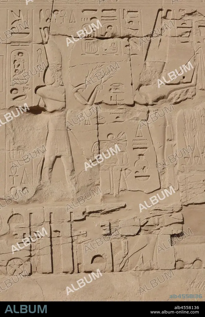 Caption: A photograph taken of the Festival Hall of Thutmose III (Akh-menu) is an ancient shrine in Luxor (Thebes), Egypt. It is located at the heart of the Precinct of Amun-Re, in the Karnak Temple Complex. The Hall is situated at the end of the Middle Kingdom court. It was initially built to celebrate the Jubilee (Heb-Sed) of the 18th dynasty Pharaoh, Thutmose III, and later became used as part of the annual Opet Festival. circa 1425 BC.