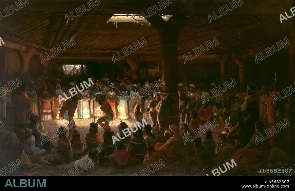 Parisian-trained artist Jules Tavernier settled in San Francisco, in the 1870s, where he received his most important commission from Tiburcio Parrott, the city's leading banker. During a visit from his Parisian business partner Baron Edmond de Rothschild, in 1876, Parrott was able to obtain entry to a sacred ritual in the Pomo Indian's underground roundhouse at Clear Lake, north of San Francisco. The two men were in the process of acquiring the mineral rich lands of the Pomo Indians, which the tribe had inhabited for generations.