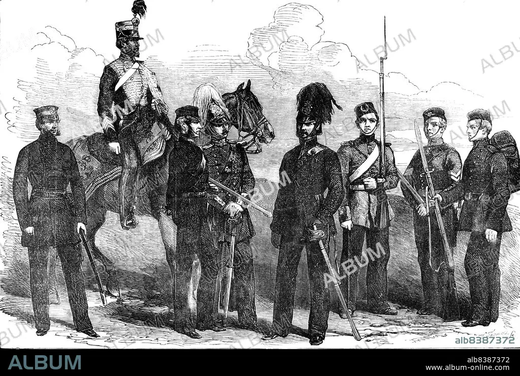 Caption: English Militia and Yeomanry Cavalry, 1854. British Army uniforms during the Crimean War. '4th Middlesex (officer); Yorkshire Hussars; Yeomanry Undress; Yeomanry Cavalry; 4th Middlesex; South Lincoln; Essex Rifles...The Illustration of the Militia Regiments...is perfectly correct as to costume; but the uniforms of the Yeomanry Cavalry there represented have not as yet been taken into general wear. The clothing of the first-mentioned force is supplied by the Ordnance, and, in texture, make, and sewing, is even inferior to that forced upon the line. Should the embodied regiments continue on permanent duty, the worthlessness of the dress, as regards durability and comfort, will be exemplified long before the period arrives which, by her Majesty's regulations, a fresh issue will be sanctioned'. From "Illustrated London News", 1854.