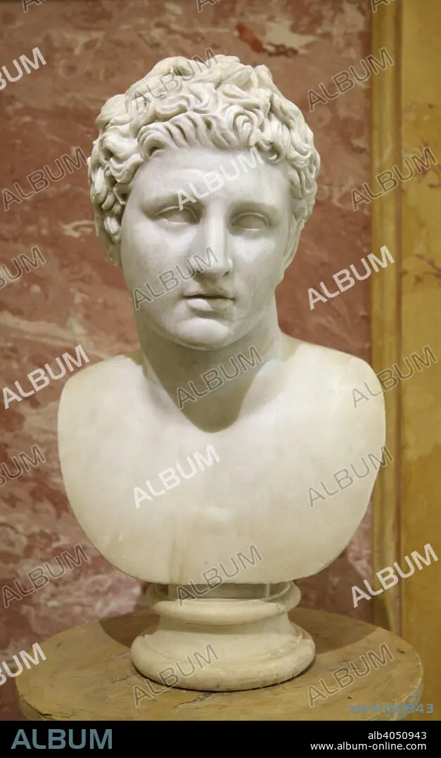 Caption: Head of Meleager, 2nd century. Roman, after a Greek original of the mid 4th century BC. According to Greem mythology, Meleager was a hero who, together with Atalanta, a female hunter, killed the Calydonian Boar. He was also one of the Argonauts. Found in the collection of The Hermitage, St Petersburg.