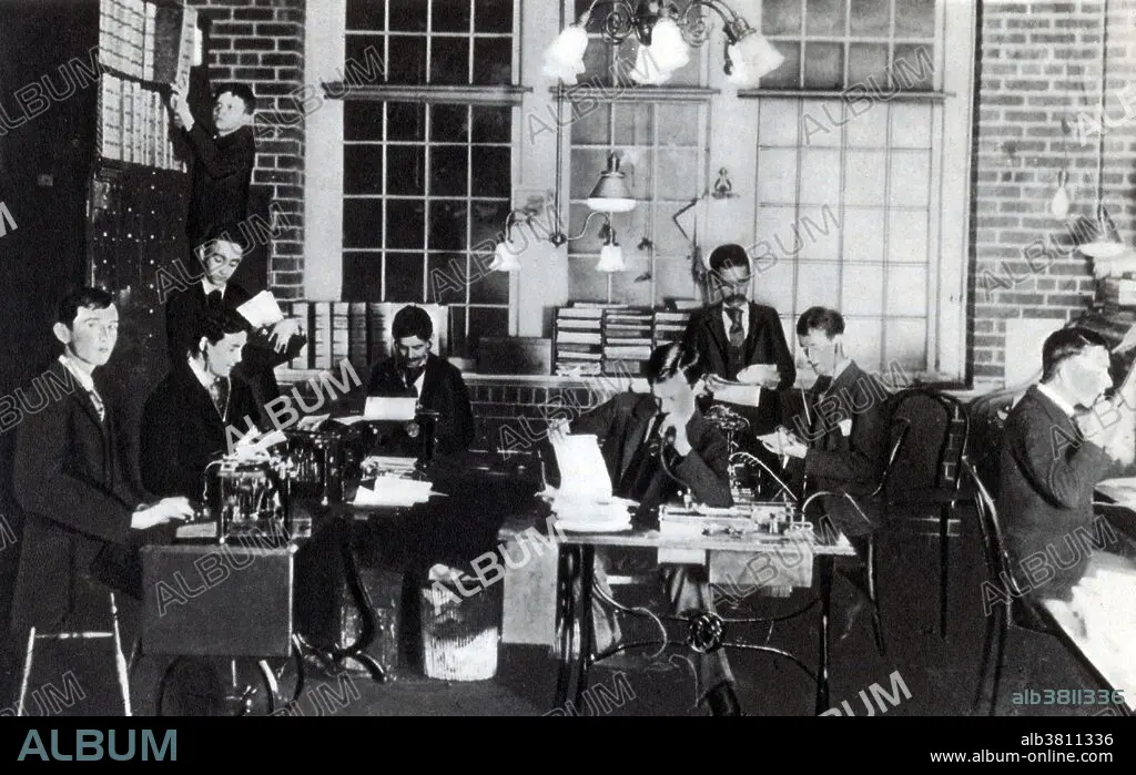 Caption: The stenographic staff, 1889. General Electric was formed through the 1892 merger of Edison General Electric Company of Schenectady, NY, and Thomson-Houston Electric Company of Lynn, MA, with the support of Drexel, Morgan & Co. Both plants continue to operate under the GE banner to this day. The company was incorporated in New York, with the Schenectady plant used as headquarters for many years thereafter. In 1896, General Electric was one of the original 12 companies listed on the newly formed Dow Jones Industrial Average. After 119 years, it is the only one of the original companies still listed on the Dow index, although it has not been on the index continuously.