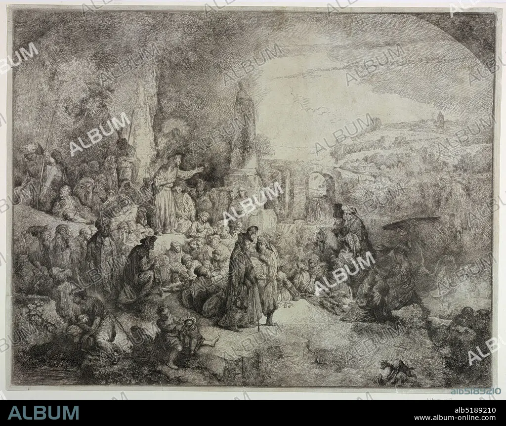 Caption: The Sermon on the Mount, Christian Wilhelm Ernst Dietrich, German, 1712 - 1774, Rembrandt Harmensz van Rijn, Dutch, 16061669, Etching on paper, Christ is seen in the left foreground with the multitude before him. In the background, a monument and a bridge spans a waterfall. Inscribed, lower right: 'Rembrandt f. / 1656'., Germany, ca. 1735, Print, Print