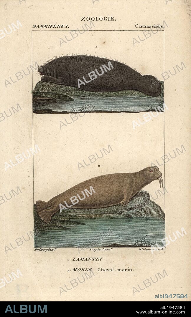 Walrus, Odobenus rosmarus, and West Indian manatee, Trichechus manatus (vulnerable). Handcoloured copperplate stipple engraving from Frederic Cuvier's "Dictionary of Natural Science: Mammals," Paris, France, 1816. Illustration by J. G. Pretre, engraved by Madame Joyeau, directed by Pierre Jean-Francois Turpin, and published by F.G. Levrault. Jean Gabriel Pretre (1780~1845) was painter of natural history at Empress Josephine's zoo and later became artist to the Museum of Natural History. Turpin (1775-1840) is considered one of the greatest French botanical illustrators of the 19th century.