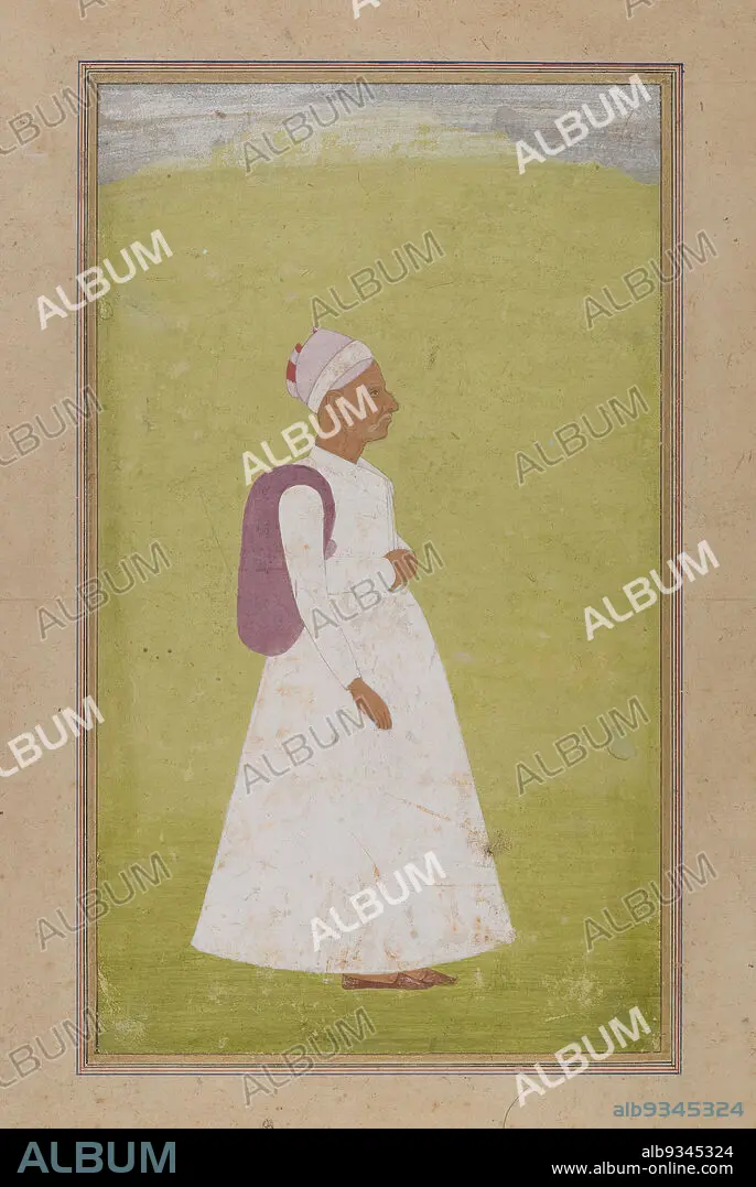 Caption: An Old Man, Indian, Opaque watercolor on paper, Jodhpur, Marwar, Rajasthan, India, ca. 1730, sheet: 9 3/8 x 5 7/16 in., 23.8 x 13.8 cm, green, man, marwar, monke, Paper, perfile, portrait, Rajasthan, regal, Watercolor, white