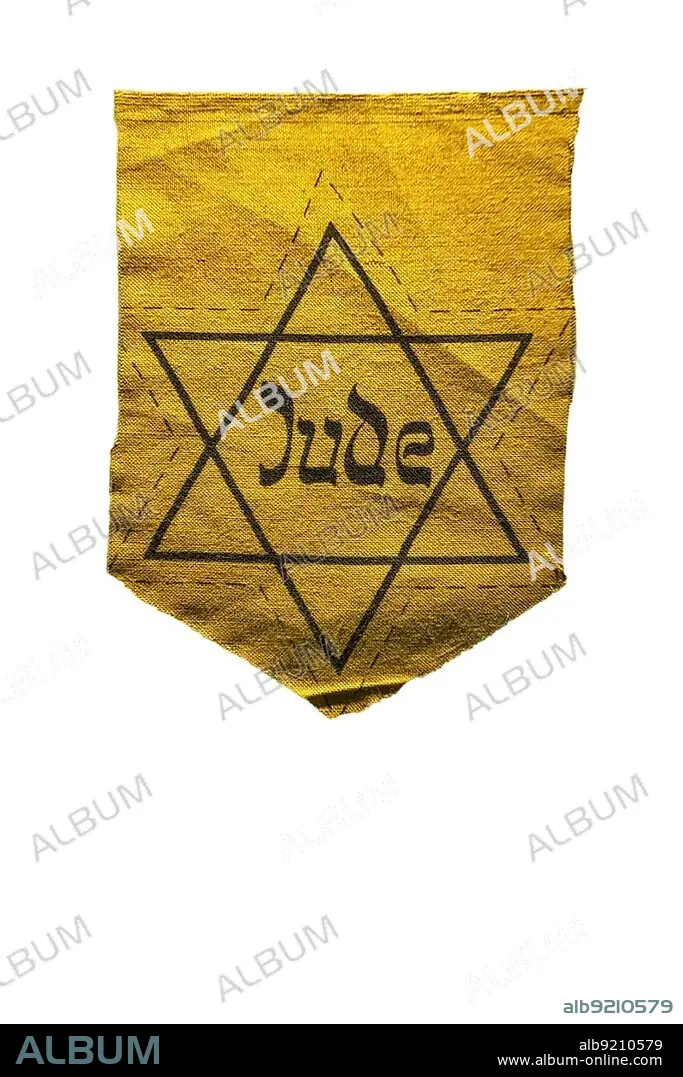 German Jewish badge showing yellow star saying Jude against white background