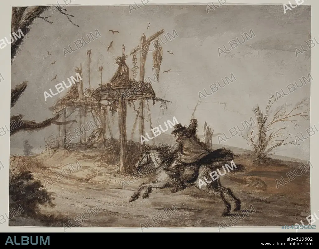 Caption: Henry William Bunbury, English, 1750-1811, Horseman in a Landscape of Hanged and Gibbeted Men, c. 1800, Pen and brown ink, brown and gray washes, sheet size: 10 1/2 x 14 5/8 in.