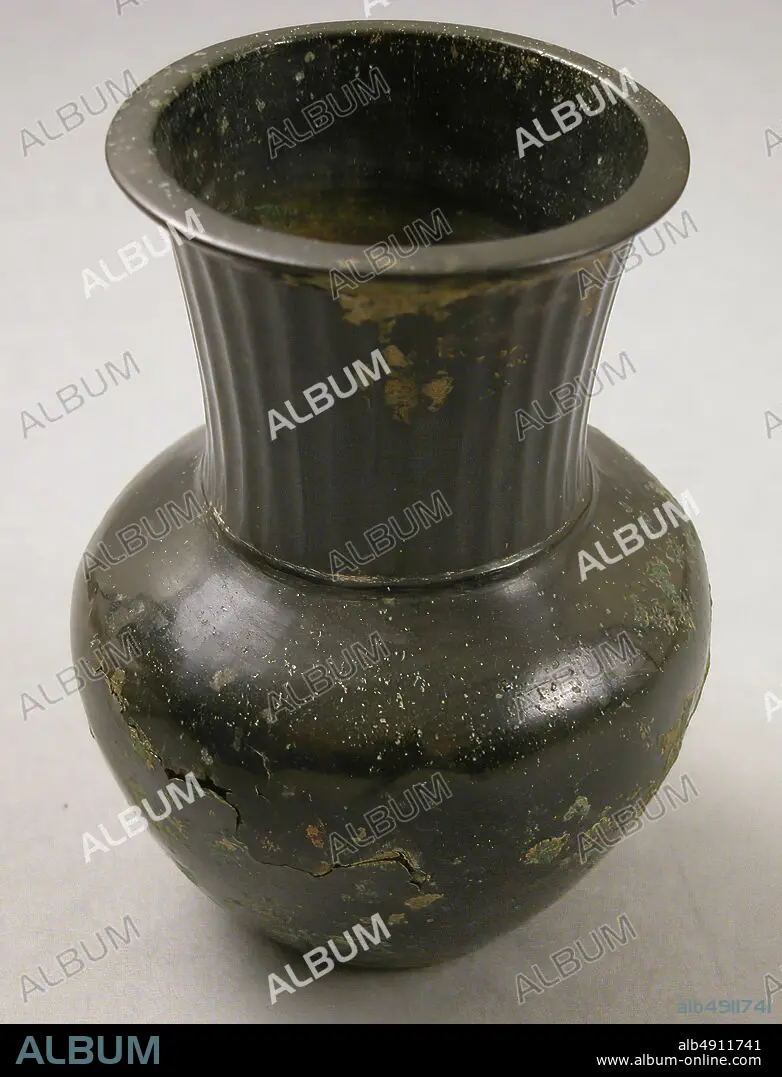 Caption: Vase, 7th8th century, Attributed to probably Iran, High-tin bronze; hammered, H. 5 1/8 in. (13 cm), Diam. 3 3/4 in. (9.5 cm), Wt. 12.7 oz. (360.1 g), Metal