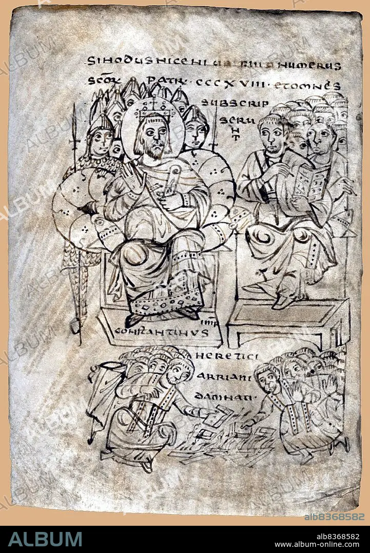 Title: Italy: Constantine the Great (272-337),57th Roman emperor, and the Council of Nicea, with the burning of Arian books illustrated below. Drawing on vellum, c. 825 CE, Biblioteca Capitolare, Vercelli