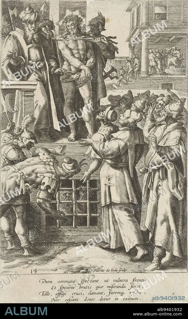 Pilate, standing on the balcony of his palace, shows Christ to the people. In the foreground, two soldiers stand bowed at a prisoner in a dungeon. In the background, Pilate washes his hands. In the margin a four-line caption in Latin. Fourteenth print in a series of twenty-four depicting the birth and passion of Christ. Christ shown to the people Birth and passion of Christ Dominicae passionis mysteria typicis adumbrationibus adamussim effigiata , print maker: Pieter de Jode (I), (mentioned on object), intermediary draughtsman: Maerten de Vos, Antwerp, 1590 - 1632, paper, engraving, h 201 mm × w 126 mm