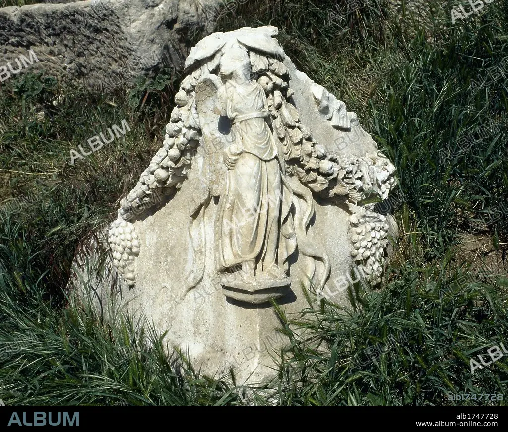 Caption: Turkey. Aphrodisias. Ancient Greco-Roman city. Fragment of a relief that decorated a Roman sarcophagus. A winged female figure is distinguished, that holds a garland of fruits and flowers. Anatolia.