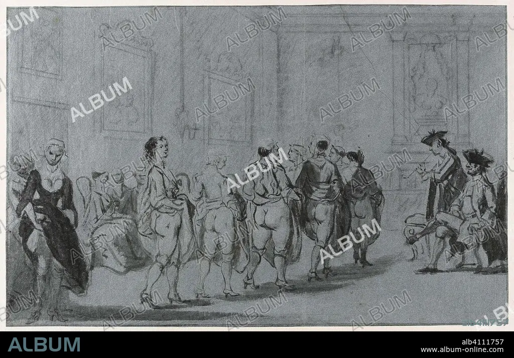 Caption: Prince Eugene of Savoy Vetting a Line-up of Prostitutes. Prins Eugenius van Savoye in het etablissement van Mme Traese op de Prinsengracht met revue van prostituées, ca. 1720. Draughtsman: Cornelis Troost. Dating: 1720 - 1730. Place: Northern Netherlands. Measurements: h 325 mm × w 513 mm.