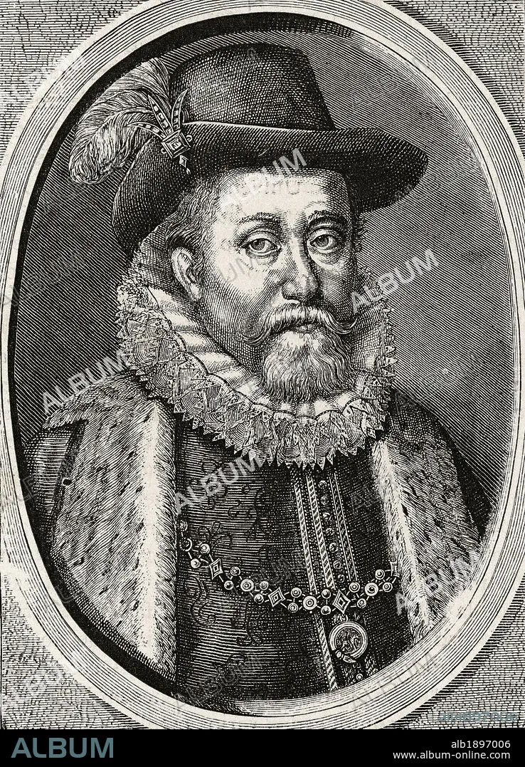 James VI and I (1566-1625). King of Scots as James VI from 24 July 1567 and King of England and Ireland as James I from 24 March 1603 until his death. Engraving.