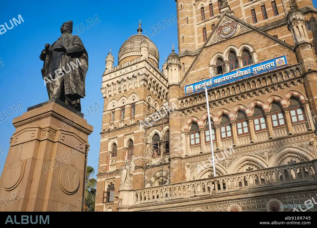 India: The Brihanmumbai Municipal Corporation (BMC) Building in Mumbai, with a statue of Sir Pherozeshah Merwanjee Mehta (1845 - 1915), Parsi politician and lawyer