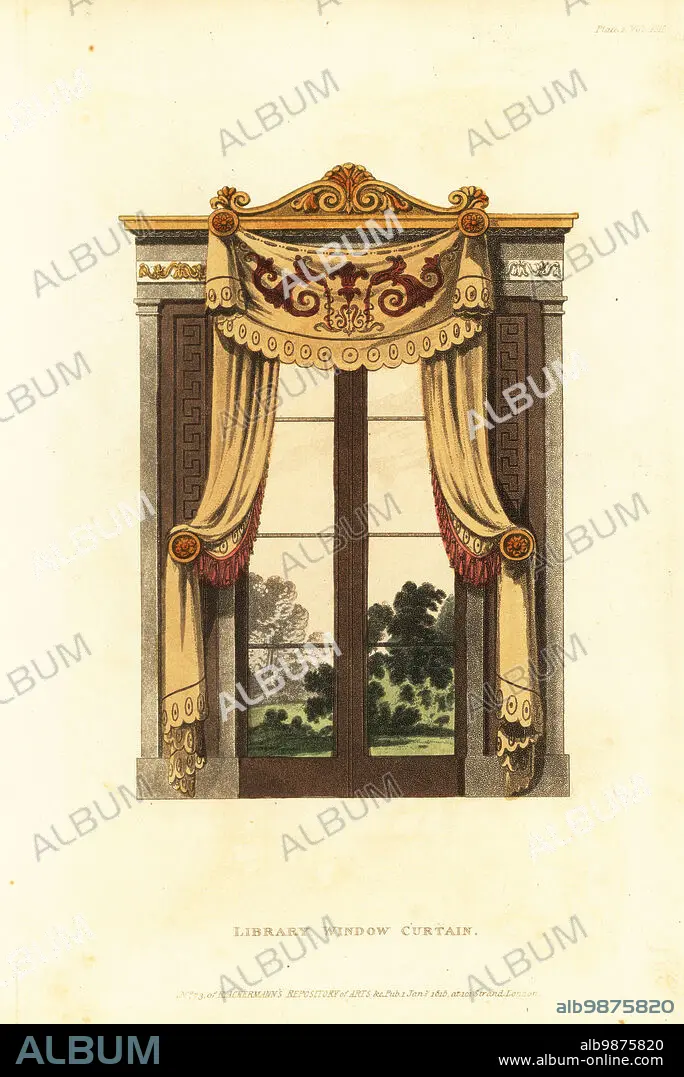 Regency-era library window curtains, 1815. Design for grand architectural additions and drapes that add Palladian or Venetian proportions to a narrow window bay. Handcoloured copperplate engraving from The Upholsterer's and Cabinet-Maker's Repository consisting of seventy-six designs of modern and fashionable furniture, Rudolph Ackermann, London, 1830.