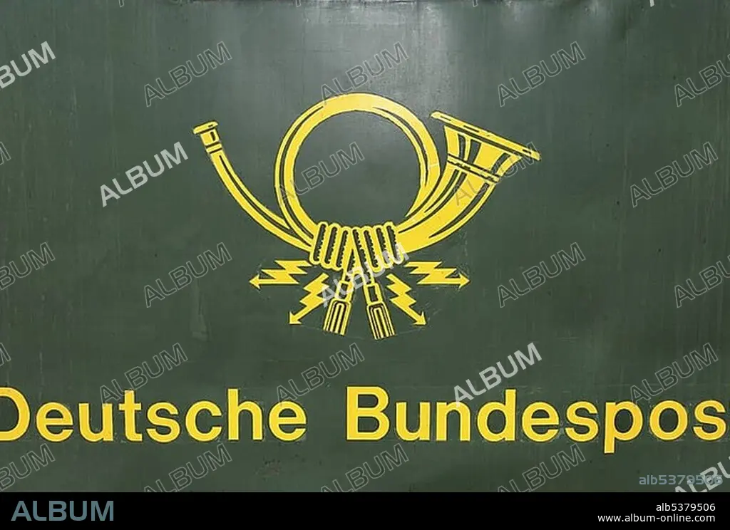 Historic wagon of the German Federal Mail with old post horn logo, circa 1960, Germany, Europe.