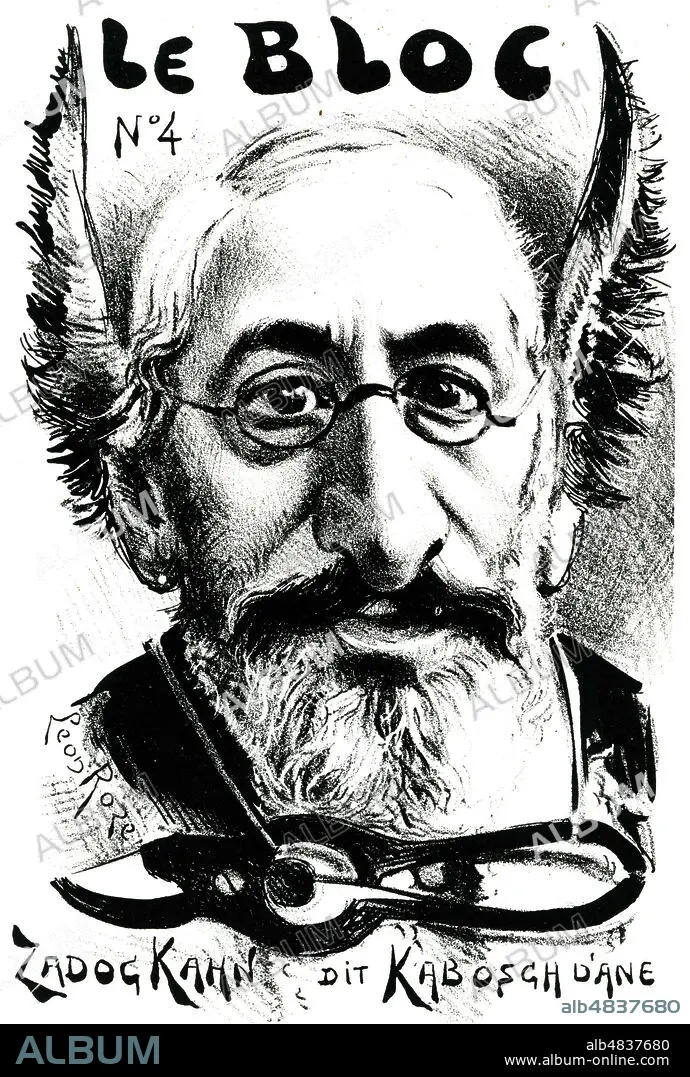 'Zadoc Kahn (1839-1905) dit Kabosch d'ane'. Caricature par Leon Roze pour la publication antidreyfusarde Le Bloc n°4, vers 1897. Credit : Collection KHARBINE-TAPABOR.