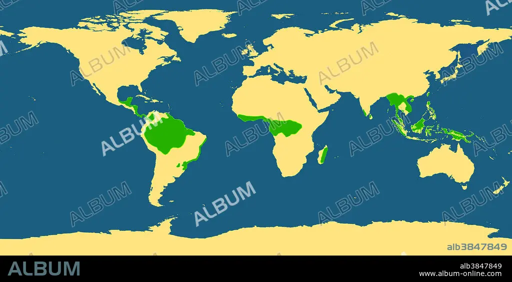 Outline of world map, showing areas covered in tropical rainforest (in green).