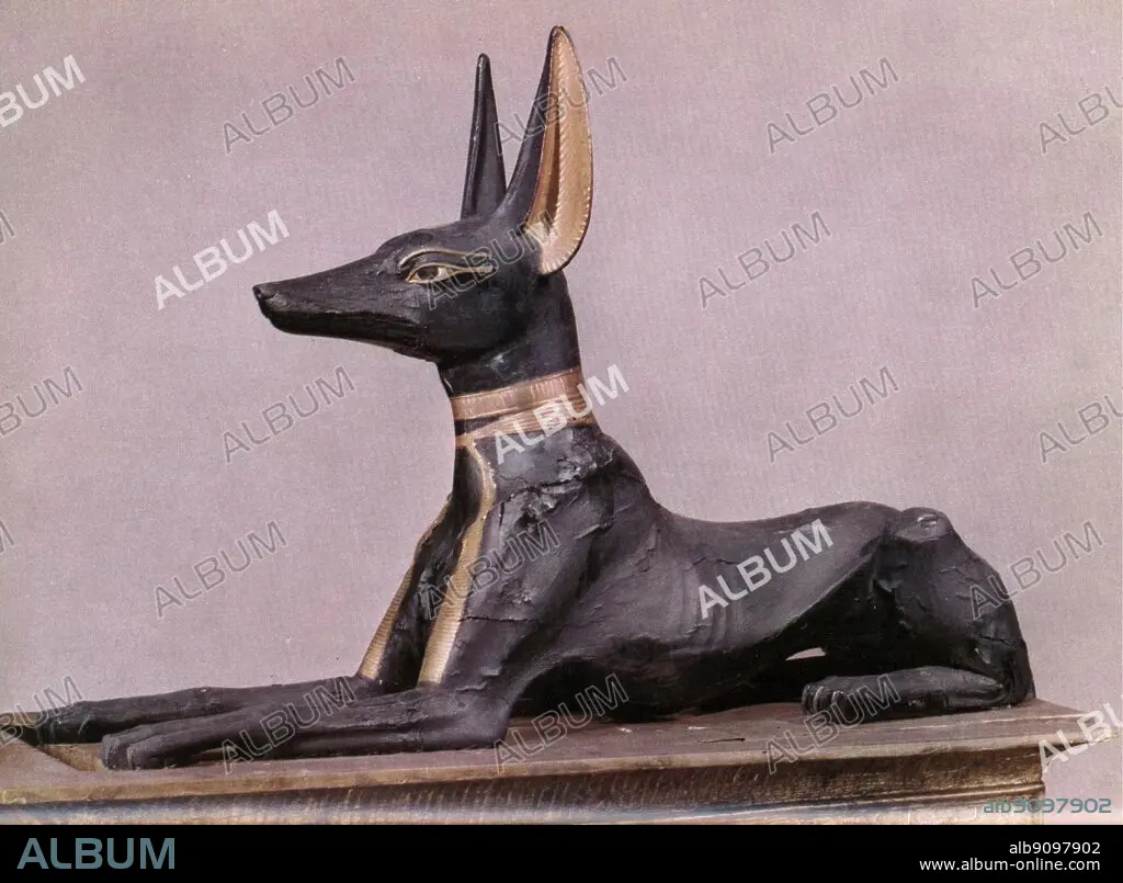 Caption: Tutankhamen in the form of the dog Anubis during the course of his transformations. Tukankhamen, by Christiane Desroches Noblecourt, page 252. Anubis, is the Greek name for the ancient god of the underworld in Egyptian mythology, who guided and protected the spirits of the dead. The hieroglyphic is more accurately spelt Anpu (also Anup, Anupu, Wip, Ienpw, Inepu, Yinepu, or Inpw). Prayers to Anubis have been found carved on the most ancient tombs in Egypt. Anubis was painted black to further link him with the deceased - a body that has been embalmed became a pitch black colour. Black was also the colour of fertility, and thus linked to death and rebirth in the afterlife.