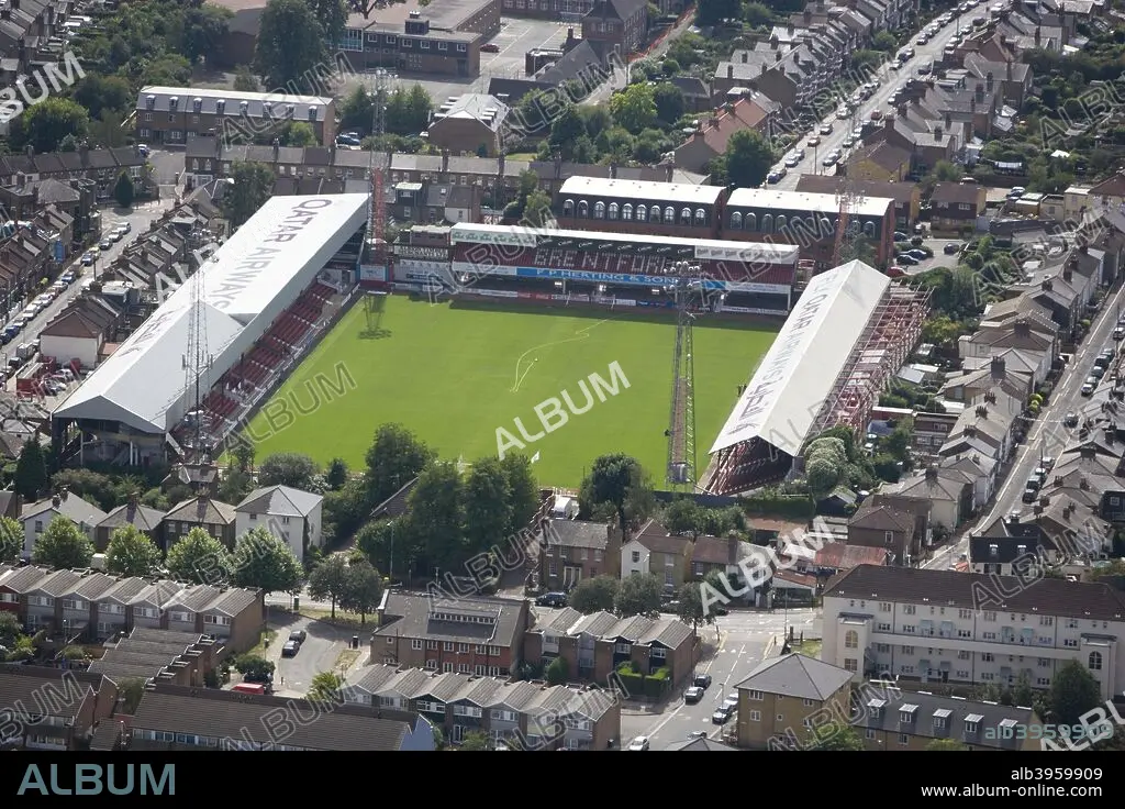 Caption: Griffin Park Stadium, Brentford, 2006. Aerial view of the home of Brentford Football Club The Bees since 1904.