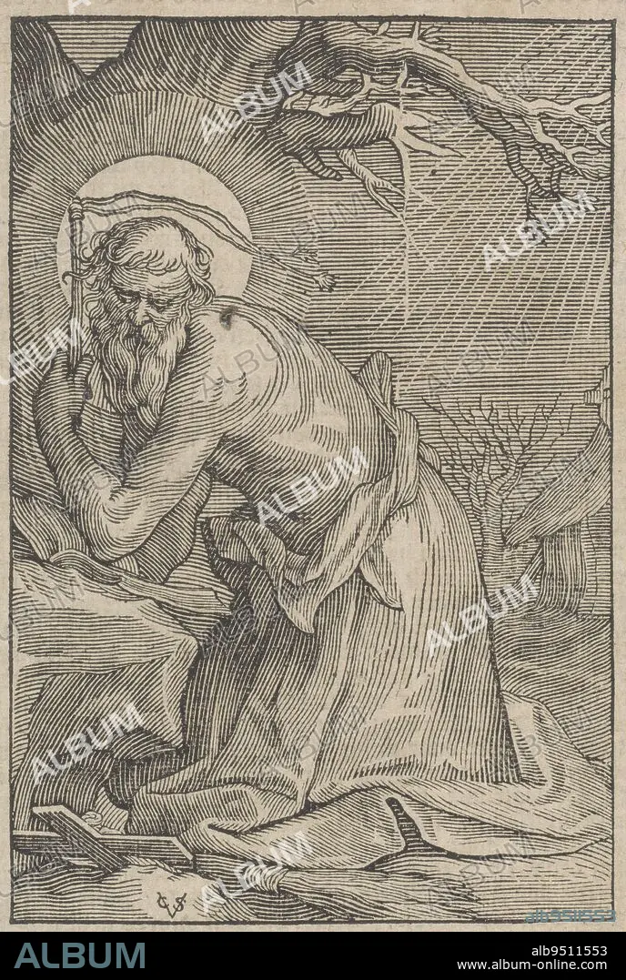 Saint Simeon Stylites the Elder as Hermit S. Simeon Stylita , print maker: Christoffel van Sichem (II), (mentioned on object), Abraham Bloemaert, publisher: Pieter Jacobsz. Paets, Amsterdam, 1644, paper, letterpress printing, h 155 mm × w 105 mm