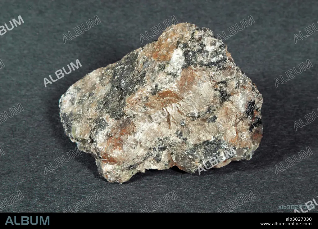 Caption: Hand sample of Pegmatite, a coarsely grained intrusive igneous rock with a composition similar to granite. Pegmatite has phaneritic texture; mineral grains are of nearly equal size and are visible to the naked eye.