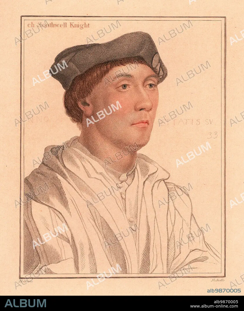 Sir Richard Southwell , aged 33, English Privy Councillor, c. 1502- 1564. [Ri]ch Southwell Knight. Anno Ettatis Su 33. Handcoloured copperplate stipple engraving by William Nicholls after a portrait by Hans Holbein the Younger from Imitations of Original Drawings by Hans Holbein, John Chamberlaine, London, 1812.