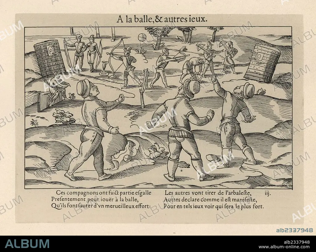 Caption: Medieval men playing ball games (handball or volleyball) and archery with longbow and crossbow in a park. Lithograph from Henry Rene Allemagne's Sports and Games of Skill (Sports et Jeux d'Adresse), Librairie Hachette, Paris, 1903.