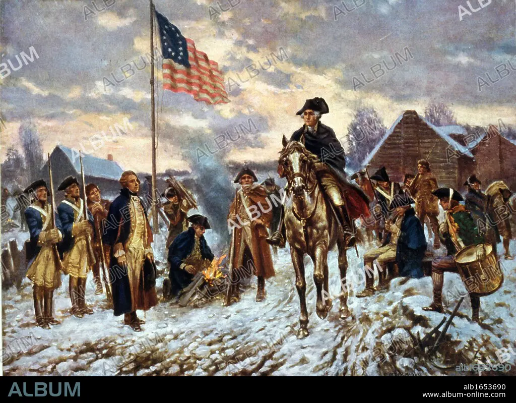Caption: Revolutionary War 1775-1783 (American War of Independence): 'Washington at Valley Forge', Pennsylvania, l December 1777 the site he chose for the winter quarters of the (American) Continental Army. After painting by Edward P Moran (1862-1935).