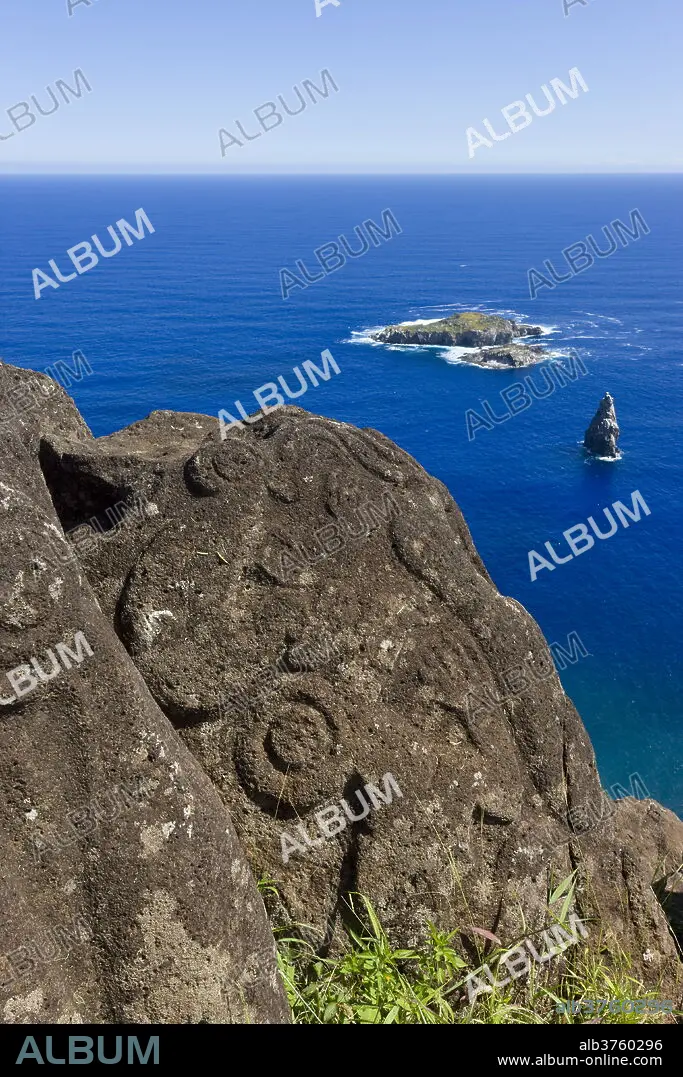 Caption: Petroglyphs at the archeological site of Orongo Ceremonial village high on the crater rim of Ranu Kau, Rapa Nui (Easter Island), UNESCO World Heritage Site, Chile, South America