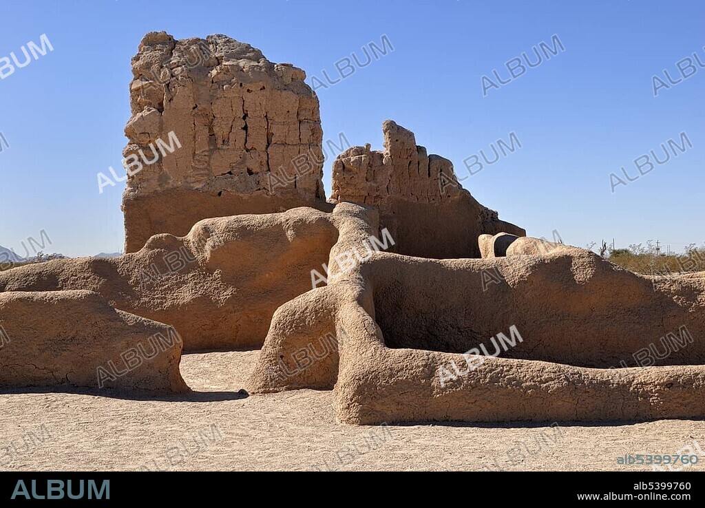 Caption: Remains of historic buildings of the Hohokam Indians, made of wattle and mortar, from around 1300 AD, Casa Grande Ruins National Monument, Coolidge, Arizona, USA, North America