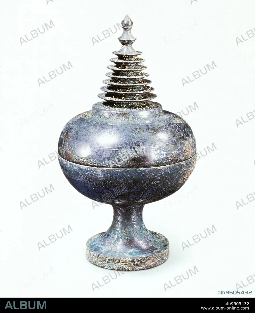 Buddhist Reliquary, 7th-8th century, 7 7/8 x 4 1/2 in. (20 x 11.43 cm), Bronze, China, 7th-8th century, Stupa-form reliquaries were used during the Tang dynasty by priests performing ceremonial worship. Ancient paintings show vessels like this placed on altars in front of Buddha images. Such containers usually held relics of a Buddhist saint (Sarira), or small precious objects that represented these persons.