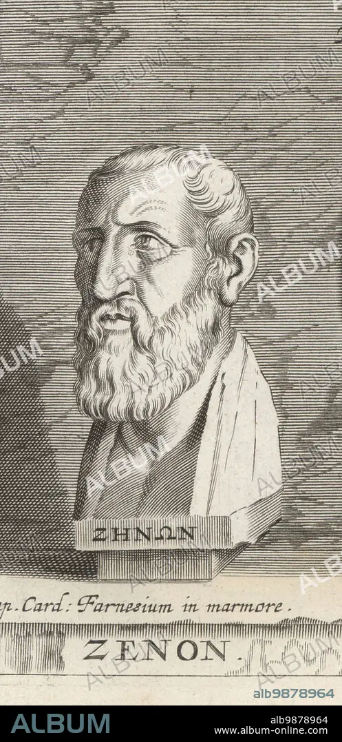 Caption: Zeno, Hellenistic philosopher from Citium, Cyprus, c.334-262 BC. Zenon of Kition. Farnesium in marmore. Copperplate engraving after an illustration by Joachim von Sandrart from his LAcademia Todesca, della Architectura, Scultura & Pittura, oder Teutsche Academie, der Edlen Bau- Bild- und Mahlerey-Kunste, German Academy of Architecture, Sculpture and Painting, Jacob von Sandrart, Nuremberg, 1675.