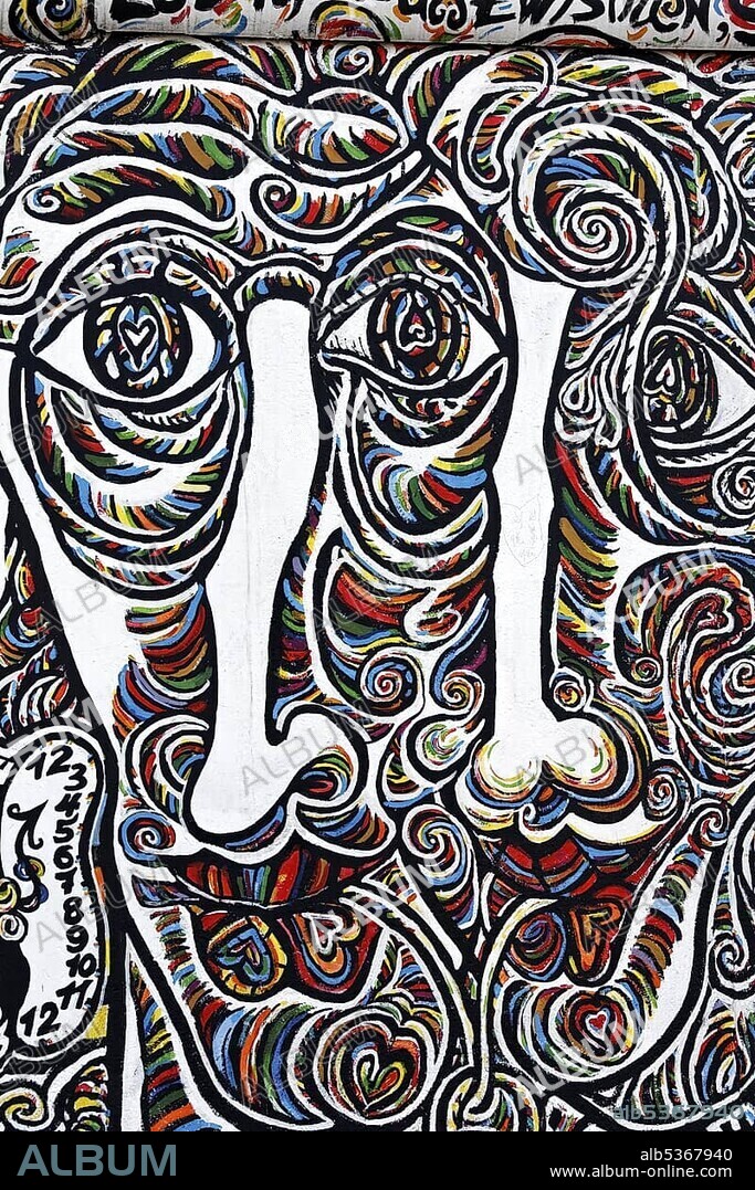 Caption: Schamil Gimajew, Picture puzzle, faces hidden in ornaments, painting on the remants of the Berlin Wall, East Side Gallery, Friedrichshain district, Berlin, Germany, Europe
