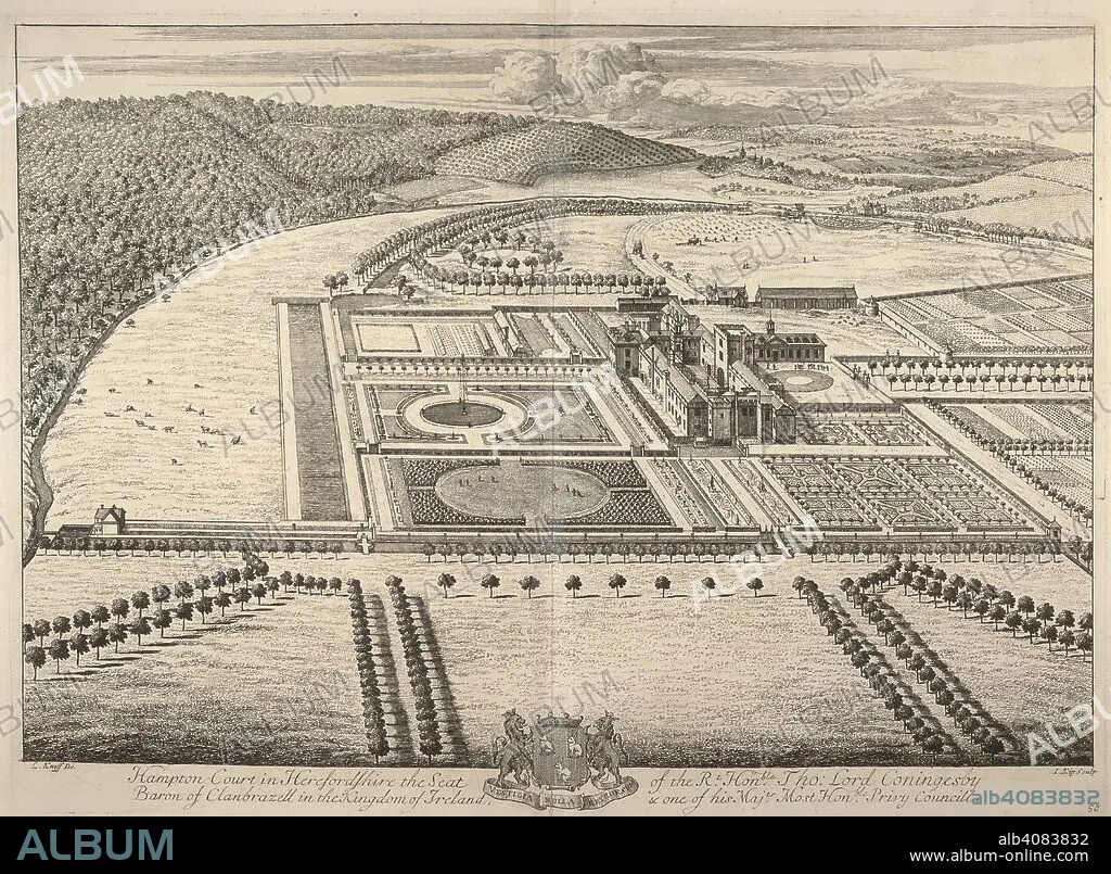 A bird's-eye view of Hampton Court in Hope under Dinmore, Herefordshire; the house at the centre of the scene; formal gardens in front and to the left; deer to the left; trees throughout the scene. Hampton Court in Herefordshire the Seat of the Rt Honble Tho: Lord Coningesby Baron of Clanbrazell in the Kingdom of Ireland, & one of his Majts Most Honble Privy Councill. [London] : [David Mortier], [1720]. Source: 191.g.15,16. Language: English.