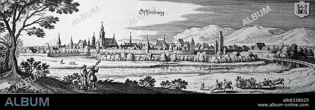 Offenburg im Mittelalter, Baden-Wºrttemberg, Deutschland / Offenburg in the Middle Ages, Baden-Wºrttemberg, Germany, historical, digital improved reproduction of an original from the 18th century / digital restaurierte Reproduktion einer Originalvorlage aus dem 18. Jahrhundert, genaues Originaldatum nicht bekannt