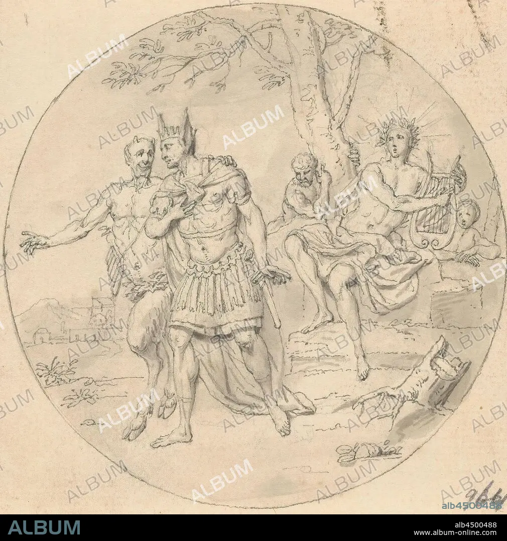 Apollo and King Midas with donkey ears (in box with 43 drawings), contest between Apollo and Pan with the mountain god Tmolus as judge, i.e. judgment of Midas, Midas often represented with ass's ears, Louis Fabritius Dubourg, 1703 - 1775, paper, ink, pencil, brush, h 95 mm × w 94 mm