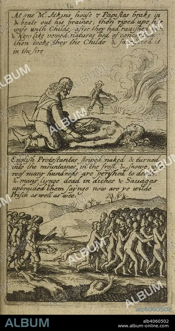 Caption: The cruel and bloodthirsty acts in Ireland during the english Civil War and the religious conflicts between Roman Catholics and Protestants. . The Teares of Ireland. England. Source: G.5557 23. Language: English.