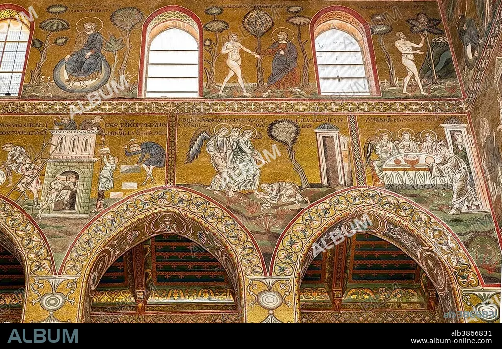 Caption: Byzantine mosaics, God rests, God leads Adam into earthly paradise, below the Tower of Babel, Abraham meets the three angels, Abraham entertains the angels, Old Testament, Monreale Cathedral or Santa Maria Nuova Cathedral, Monreale, Province of Palermo, Sicily, Italy, Europe