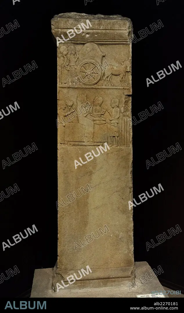 Anatolian-Persian funerary stele, 5th century BC. Marble. From Daskylaion (Ergili, Lake Manyas). Stele with depiction of a funerary cortege in two scenes: two mourning women walk behind a funeral cart (upper scene). A woman and a bearded man sit on a couch (lower scene). The woman's left hand holds an object, while her right hand receives an egg from the man. The couch is flanked by servants or slaves. On the right, the slave stands in front of a vessel placed on a tripod. On the left, the other slave carries a fruit bowl. Archaeological Museum. Istanbul, Turkey.