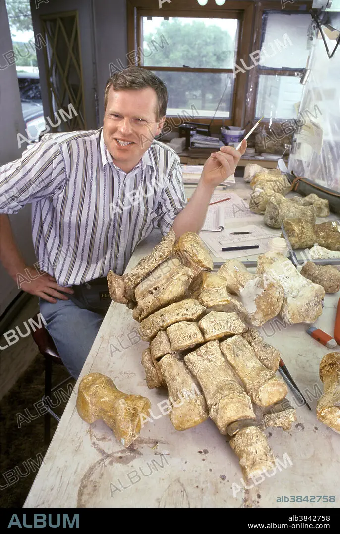 Caption: Editorial use only . Palaeontologist Dick Mol with hind foot of a Columbian mammoth, Mammuthus columbi, South Dakota.