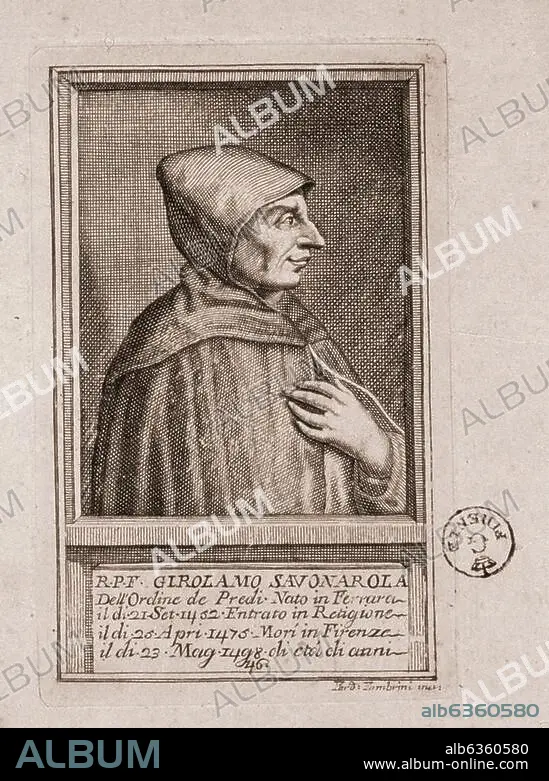 Caption: Savonarola, Girolamo. Italian preacher; Ferrara (Italy) 21.9.1452 - (executed). Florence 23.5.1498. "GIROLAMO SAVONAROLA (...) ". Copper engraving, undated, by Ferdinando Fambrini (active 1764-90). Inv. no. 8407. Florence, Gabinetto Disegni e Stampe.