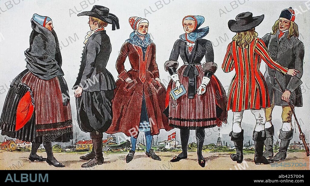 Caption: People in traditional costumes, fashion, clothes in Denmark, costumes around 1800, illustration, Denmark, Europe