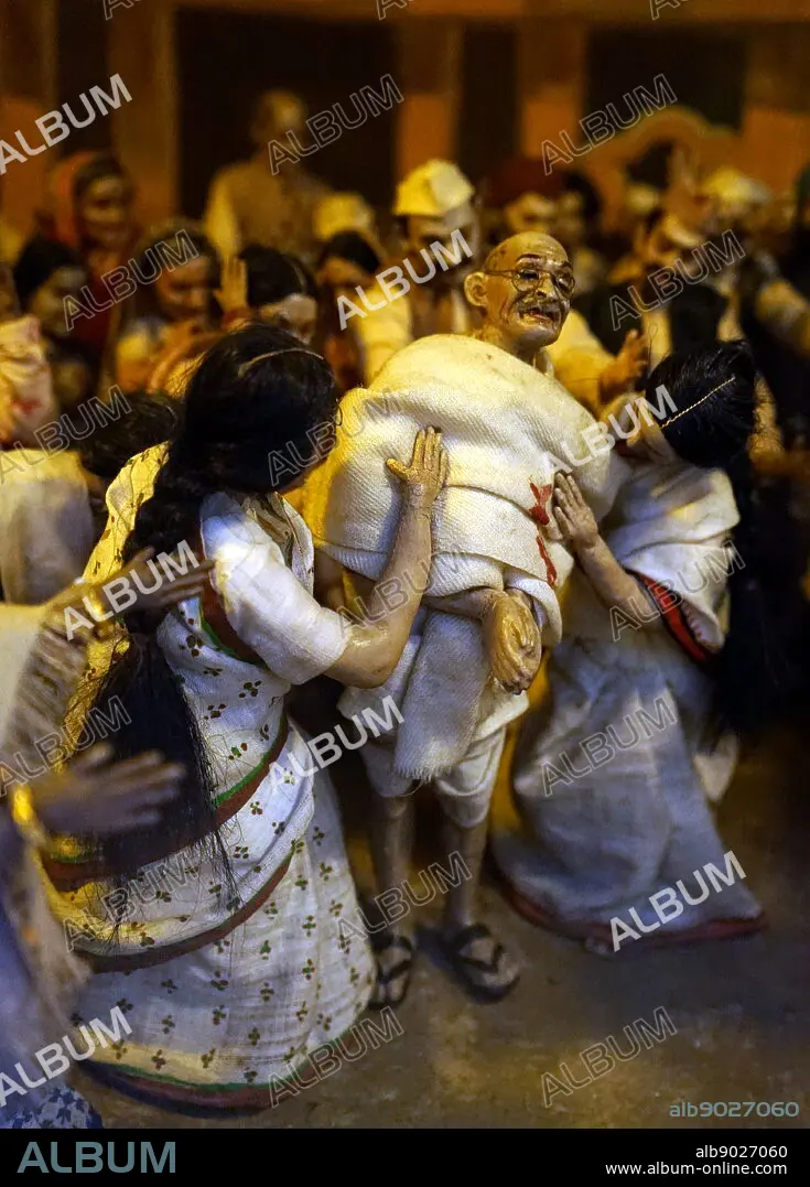 Caption: Photograph of a model reconstructing the assassination of Mahatma Gandhi in New Delhi India. On the 30th January 1948, Gandhi (1869-1948) was with his grandnieces in the garden of the former Birla House (now Gandhi Smriti), on his way to address a prayer meeting, when Nathuram Godse (1910-1949) fired three bullets from a Beretta 9 mm pistol into his chest at point-blank range. Dated 21st Century